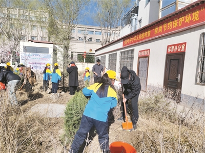 在拉鲁小学校园内的种植区,区、市教育部门和市生态环境局等单位相关负责人和师生们挥锹挖坑、扶苗培土、提水浇灌,每一个环节都认真细致。