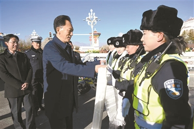 “大家辛苦了!”在北京中路交警执勤点,肖友才向城北交警大队女子中队民辅警献上洁白哈达并致以亲切问候。他说,过去一年,大家以良好的精神风貌、严整的警容风纪、辛勤的日夜坚守,有力保障了交通安全、维护了城市形象,是拉萨街头最靓丽的风景线。要继续保持高昂的工作热情和优良的工作作风,在新的一年里恪尽职守、认真履职,为城市顺畅运行和群众安全出行保驾护航。
