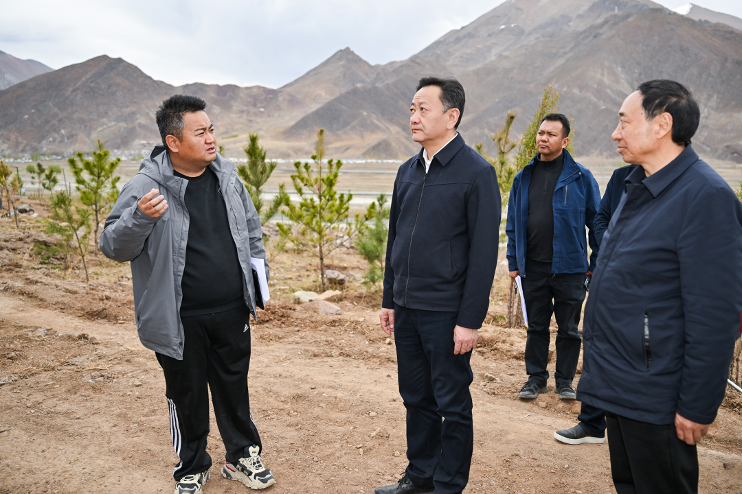 近日,自治区党委常委、拉萨市委书记达娃次仁调研南北山堆龙片区绿化工作。这是达娃次仁在马镇、德庆镇片区察看苗木生长状况,与现场工作人员交流,了解绿化规划、树种选择、水源保障等情况。记者 崔成 摄