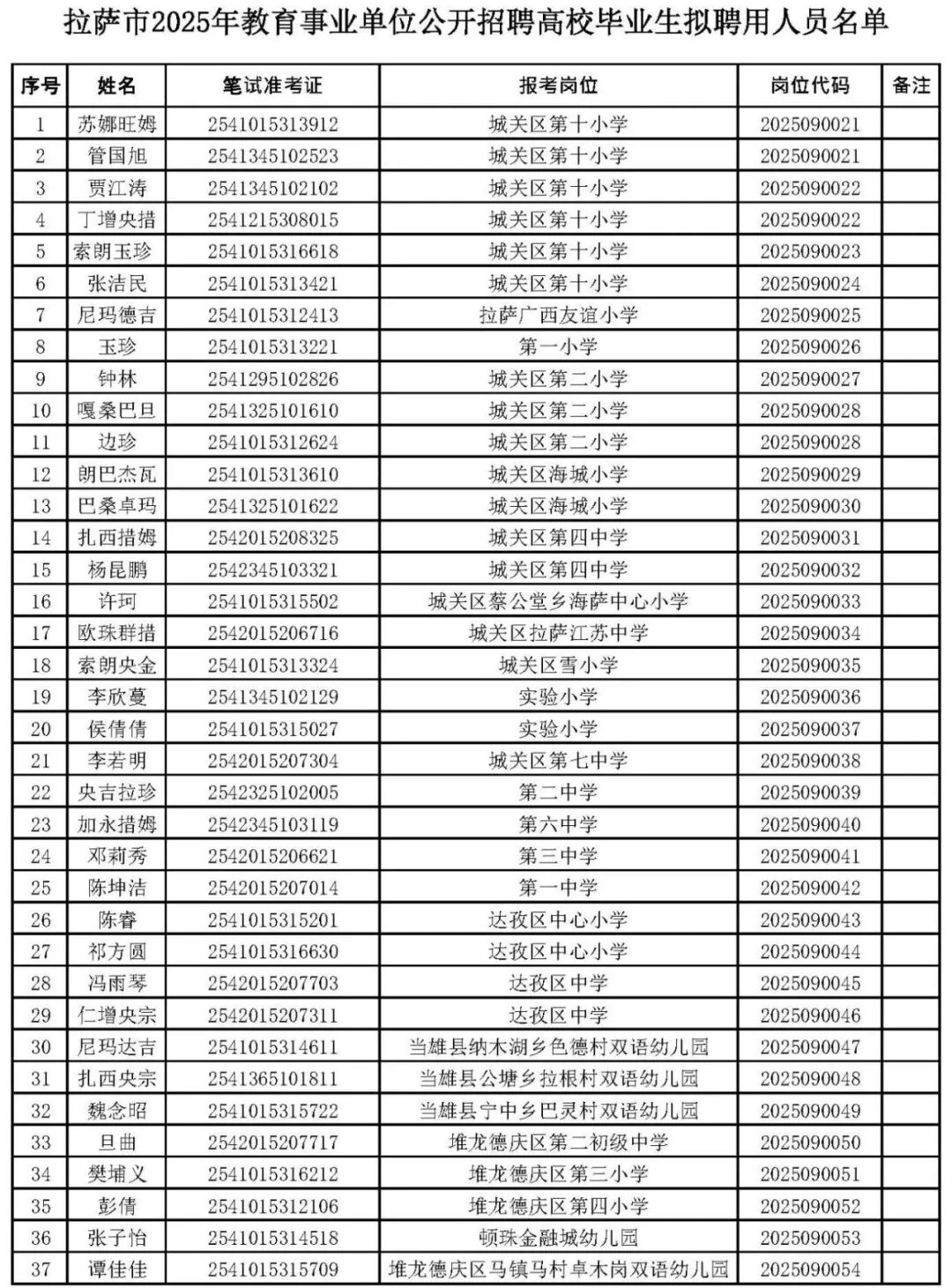 关于拉萨市2025年教育事业单位公开招聘高校毕业生拟聘用人员名单的公示