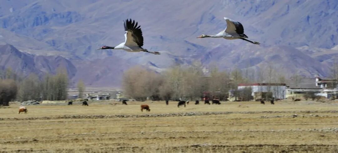 人鹤共处,生态和谐画卷,除了黑颈鹤晨飞暮归的画面,黑颈鹤与当地民众也在共同谱写高原上的和谐之歌。它们或在收割后的田地里悠然觅食,或与放牧的牛群相伴而行,或在河滩湿地舒展身姿、翩翩起舞,演绎一幅幅“人鹤共处、自然共生”的画面。