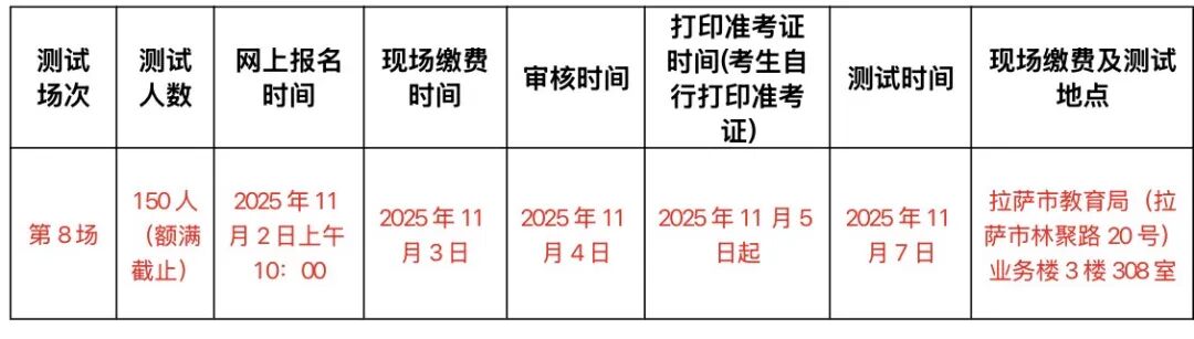 三线下缴费考生于2025年11月3日,上午10:00-12:30;下午3:30-5:30。持本人有效身份证件到拉萨市教育局(拉萨市林聚路20号)业务楼3楼308室(拉萨市国家通用语言文字推广服务中心)进行现场缴费(微信或支付宝均可)。四打印准考证