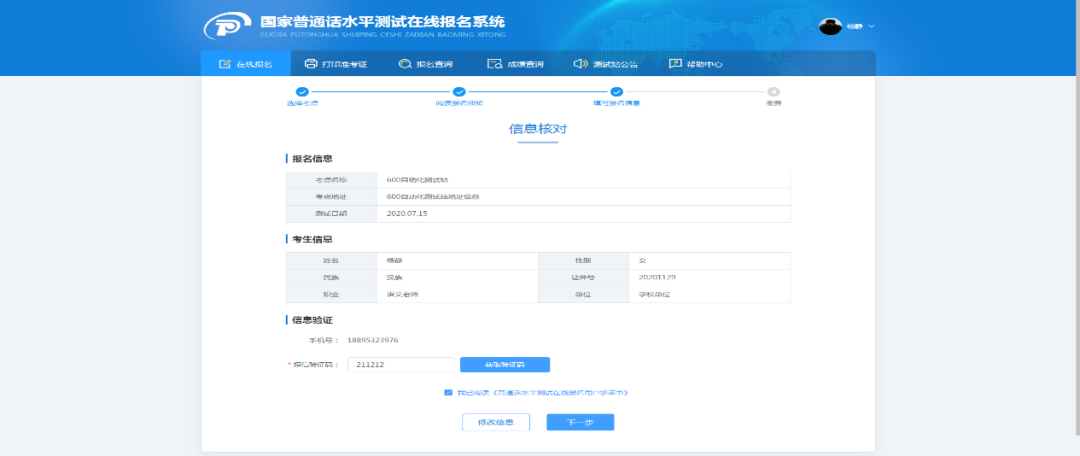核对报名及考生信息并进行验证,若信息有误,点击“修改信息”返回报名信息填写页面中,无误点击“下一步”(注意:信息一旦提交,无法修改)。点击发送短信,正确点击图片验证,并准确输入手机收到的验证码。