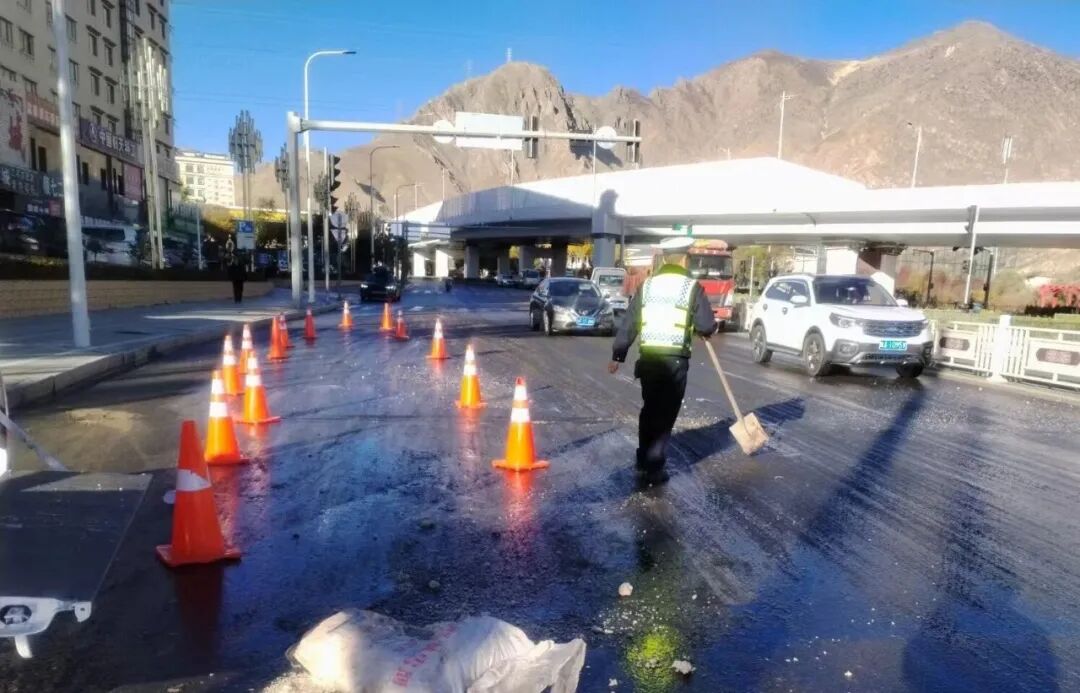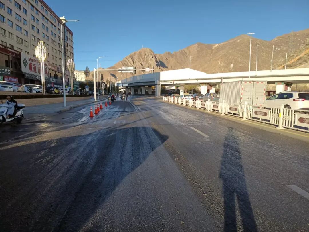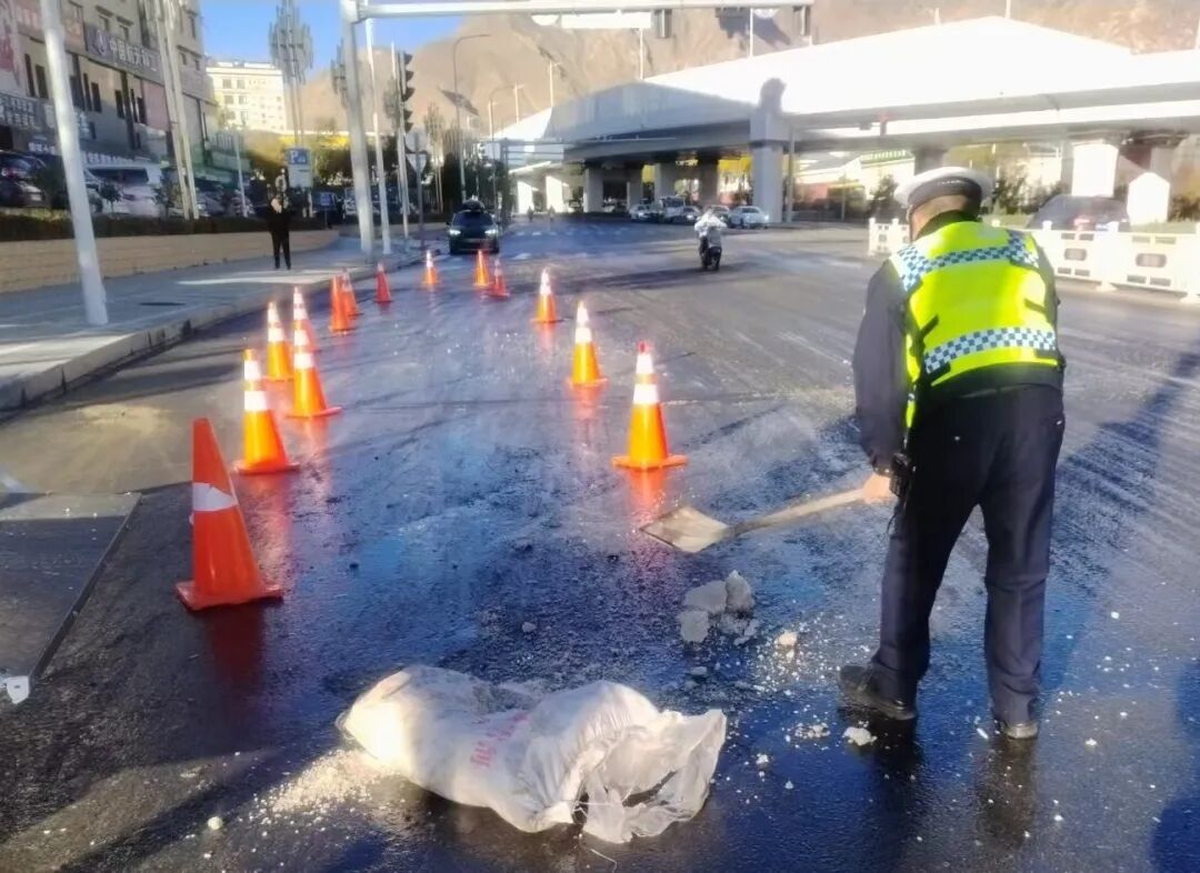 拉萨交警“撒盐+疏导”,为结冰路“解冻”护平安