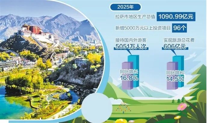 一系列举措成效显著。2025年,拉萨市接待国内外游客5051万人次,同比增长16.8%;实现旅游总花费606亿元,同比增长14.5%。