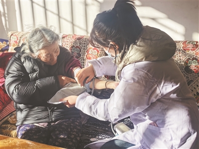 图为社区工作人员为居民量血压。拉萨融媒记者 王静敏摄