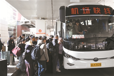 图为旅客正有序登上前往市区的大巴。拉萨融媒记者 格桑卓嘎摄