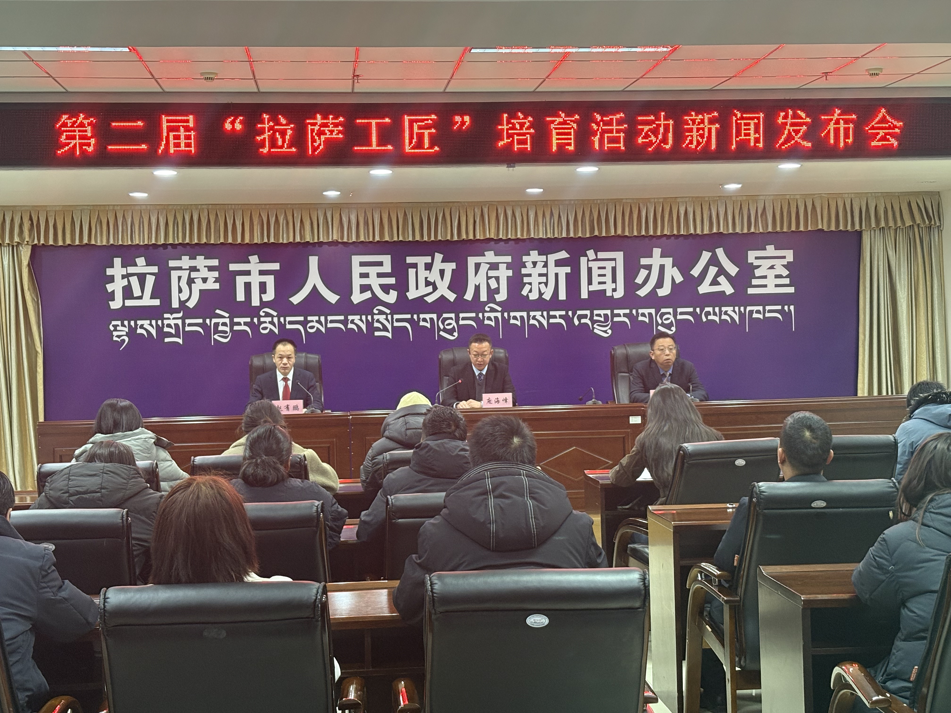 2025年12月24年日上午,拉萨市人民政府新闻办公室召开第二届“拉萨工匠”培育活动新闻发布会,新闻发布会由市委宣传部副部长赵有鹏主持。拉萨市总工会党组成员、副主席庞海峰同志,拉萨市总工会党组成员、二级调研员洛桑占堆同志,为大家介绍第二届“拉萨工匠”培育活动开展情况,并回答记者提问。