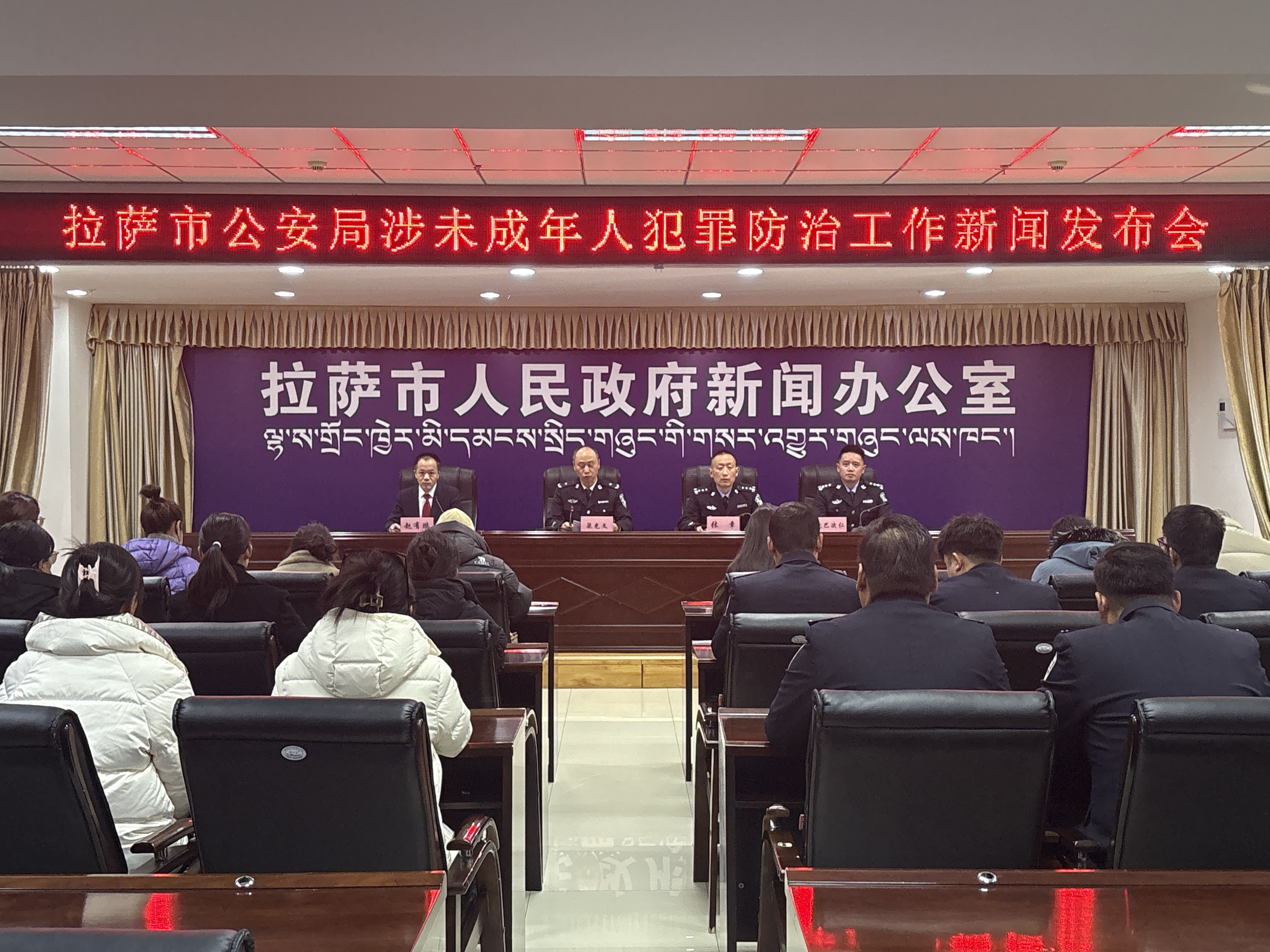 2025年12月24年日上午,拉萨市人民政府新闻办公室召开拉萨市公安局涉未成年人犯罪防治工作开展情况新闻发布会,新闻发布会由市委宣传部副部长赵有鹏同志主持。拉萨市公安局党委副书记梁光文同志,拉萨市公安局治安支队副支队长张章同志,为大家介绍拉萨市公安局涉未成年人犯罪防治工作开展情况,并回答记者提问。